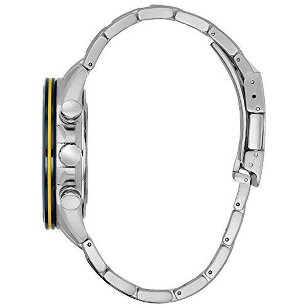 Montre ronde en acier inoxydable avec marque et contrastes jaunes sur le cadran avec chronométrage automatique dans 26 villes du monde et trio de sous-cadrans chronographes ; technologie de chronométrage atomique avec réglage de l'heure synchronisé disponible en 26 fuseaux horaires, affiché comme villes, chronographe à calendrier perpétuel, chronographe 1/20 seconde, indicateur de réserve de marche, heure 12/24 heures Boîtier argenté de 43 mm avec cadran en saphir antireflet Mouvement à quartz japonais avec affichage analogique Dispose d'un bracelet en acier inoxydable avec rabat et de la technologie Eco-drive à alimentation légère. Tournez la couronne dans le sens inverse des aiguilles d'une montre jusqu'à ce qu'elle se détache de l'étui Étanche jusqu'à 200 m : convient en général pour les activités marines professionnelles et les sports nautiques de surface, mais pas pour la plongée sous-marine